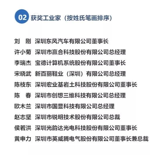 有“深圳工業(yè)界奧斯卡”美譽的“深圳工業(yè)大獎”,是深圳工業(yè)界的最高榮譽,自2013年創(chuàng)辦,每兩年評選一次,旨在弘揚工業(yè)精神,營造重視實體經濟的社會氛圍,表彰深圳工業(yè)企業(yè)和工業(yè)家的突出成就,樹立深圳工業(yè)界高質量發(fā)展標桿,充分發(fā)揮深圳工業(yè)企業(yè)在“雙區(qū)”建設中重要作用。