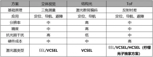 激光雷達(dá)行業(yè)技術(shù)處于生命周期初期,多維度、多元化技術(shù)創(chuàng)新不斷涌現(xiàn)。技術(shù)創(chuàng)新帶來(lái)的產(chǎn)品升級(jí)是機(jī)器視覺(jué)行業(yè)規(guī)模擴(kuò)大的核心驅(qū)動(dòng)力。掃地機(jī)器人是近年來(lái)增長(zhǎng)迅猛的智能機(jī)器人領(lǐng)域。當(dāng)前在掃地機(jī)器人移動(dòng)導(dǎo)航領(lǐng)域的主流技術(shù)是 SLAM (Simultaneous Localization and Mapping)即時(shí)定位與地圖構(gòu)建技術(shù)。按傳感器種類來(lái)劃分,SLAM技術(shù)主要分為兩類,一類是基于激光測(cè)距傳感器的LDS SLAM技術(shù),另一類是基于機(jī)器視覺(jué)的VSLAM技術(shù)。LDS SLAM目前為市場(chǎng)主流技術(shù)。表一對(duì)三種主流的LDS SLAM方案進(jìn)行了對(duì)比。立體視覺(jué)方案憑借其在分辨率、測(cè)量精度、抗干擾性和成本等方面的綜合優(yōu)勢(shì),是目前被廣泛采用的LDS SLAM方案。ToF方案的地圖構(gòu)建能力更強(qiáng),但相對(duì)成本較高。結(jié)構(gòu)光方案由于測(cè)量距離受限和抗干擾性相對(duì)較弱,應(yīng)用也相對(duì)受限。在應(yīng)用相對(duì)廣泛的立體視覺(jué)和ToF方案中,傳統(tǒng)的激光雷達(dá)光源一般采用邊發(fā)射激光器 (EEL)。檸檬光子基于自主研發(fā)的高性能垂直腔面發(fā)射激光芯片(VCSEL)和水平腔面發(fā)射激光芯片(HCSEL),為主流的LDS SLAM系統(tǒng)提供性能更優(yōu)異的激光光源方案。