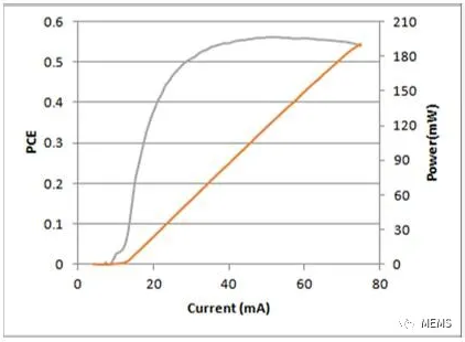 圖二:檸檬光子多結(jié)VCSEL芯片實(shí)測(cè)LI和PCE數(shù)據(jù)(測(cè)試條件:200μs脈沖寬度,1%占空比)