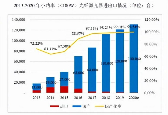 從國產(chǎn)化替代現(xiàn)狀來看,不同功率激光器的國產(chǎn)化率有差異。下圖摘自長光華芯招股書,能夠較為明顯地看出不同功率之下光纖激光器的國產(chǎn)化替代情況。2019年,小功率光纖激光器的國產(chǎn)化率就已經(jīng)逾99%,幾乎實現(xiàn)全覆蓋。而同年中功率及高功率光纖激光器的國產(chǎn)化率都在56%左右,國產(chǎn)化替代市場仍舊有一定空間。