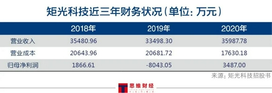 矩光科技財報顯示,近三年公司營業(yè)收入、營業(yè)成本和歸母凈利潤有所波動,2020年歸母凈利潤為3487萬元,2019年、2018年的歸母凈利潤分別為-8043.05萬元、1866.61萬元。