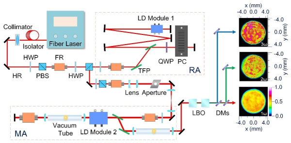 該研究中,紫外激光器由前端可編程種子源、光隔離系統(tǒng)、再生放大器(RA)、光束整形器、主放大系統(tǒng)(MA)、諧波轉(zhuǎn)換單元等部分組成。研究人員通過(guò)精確調(diào)控Nd:YAG激光器放大后基頻激光脈沖的時(shí)間波形和空間分布,以提高其時(shí)空填充系數(shù)。120mJ、100Hz的1064nm激光脈沖通過(guò)兩塊LBO晶體進(jìn)行三倍頻后獲得了脈沖能量為91mJ、脈寬470ps的355nm激光脈沖,三倍頻轉(zhuǎn)換效率高達(dá)76%,脈沖能量穩(wěn)定性在3小時(shí)優(yōu)于1.07%(RMS),實(shí)現(xiàn)了重頻皮秒固態(tài)激光器中最高三倍頻轉(zhuǎn)換效率。