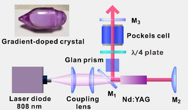 近日,中國(guó)科學(xué)院合肥物質(zhì)科學(xué)研究院健康與醫(yī)學(xué)技術(shù)研究所江海河課題組與安徽光學(xué)精密機(jī)械研究張慶禮課題組合作,設(shè)計(jì)研制了梯度濃度摻雜的釔鋁石榴石晶體(Nd:YAG)激光系統(tǒng),實(shí)現(xiàn)了高重復(fù)頻率電光調(diào)Q激光輸出。相比傳統(tǒng)均勻摻雜晶體,梯度濃度晶體顯著提高了輸出平均功率和峰值功率,并獲得了高光束質(zhì)量的激光輸出。相關(guān)研究成果發(fā)表在Optics Letters上。