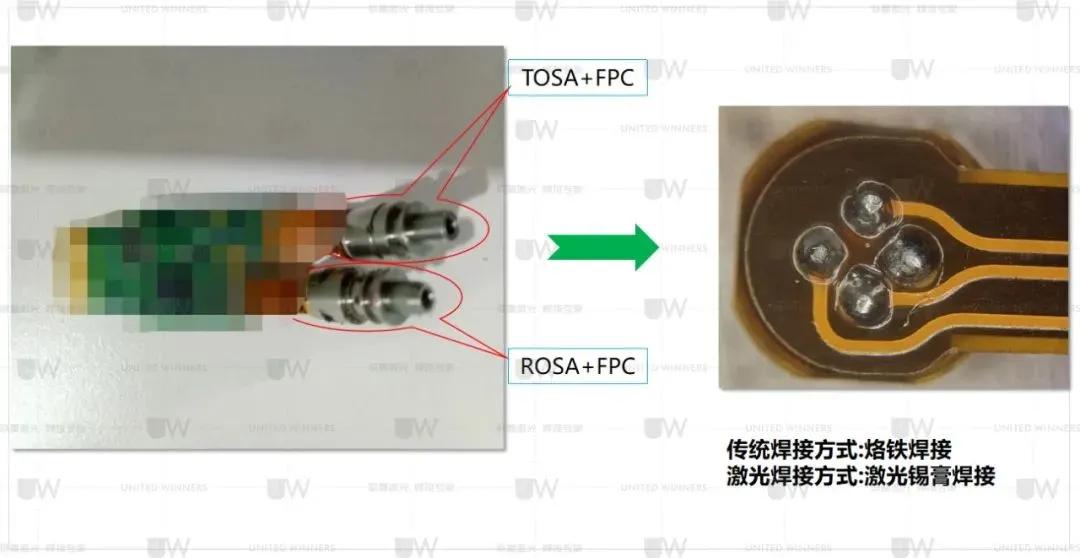 一個光模塊,通常由光發(fā)射器件(TOSA,含激光器)、光接收器件(ROSA,含光探測器)、功能電路和光(電)接口等部分組成。由于光模塊本身集成度高,且大量使用FPC軟板,因此激光焊接相較于傳統(tǒng)的烙鐵焊接、熱風(fēng)焊接、HotBar焊接、電子壓焊、波峰焊接等更適用于光通訊模塊的制造。