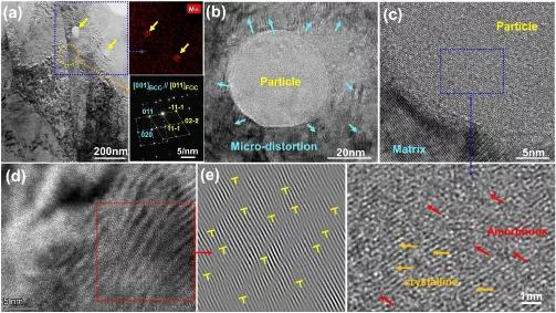 圖 9. 成品樣品的 TEM 顯微結(jié)構(gòu)觀察。(a) BF-TEM 圖像以及所選區(qū)域的 EDS 圖和 SADP,(b) 顆粒的形態(tài),(c) 對(duì)顆粒微觀結(jié)構(gòu)的特寫(xiě)觀察,所選放大圖像顯示結(jié)晶-非晶復(fù)合材料 結(jié)構(gòu),以及 (d) 粒子周?chē)兊男螒B(tài),F(xiàn)FT 圖像顯示位錯(cuò)(用“T”標(biāo)記)。