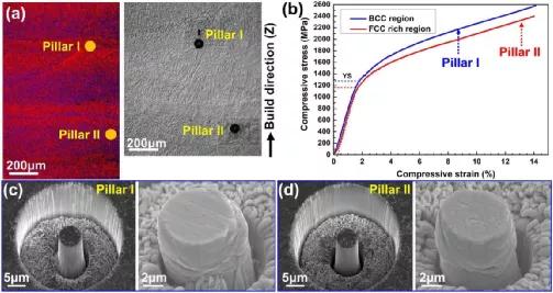 圖 12. 420SS 成品后的微觀力學(xué)性能。(a) 微柱位置的相位分布圖和 OM 圖像,(b) 柱的壓縮應(yīng)力-應(yīng)變曲線,以及 (c) 柱 I 和 (d) 柱 II 壓縮測(cè)試前后的 SEM 形貌。