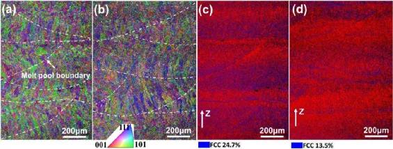圖 4. 樣品沿構(gòu)建方向 (Z) 的低倍率 EBSD 分析。(a) 和 (b) 分別是成品樣品和 HT427 樣品的 IPF;(c) 和 (d) 分別是成品樣品和 HT427 樣品的相位分布圖。(c) 和 (d) 中的紅色和藍(lán)色區(qū)域分別代表 BCC 和 FCC。