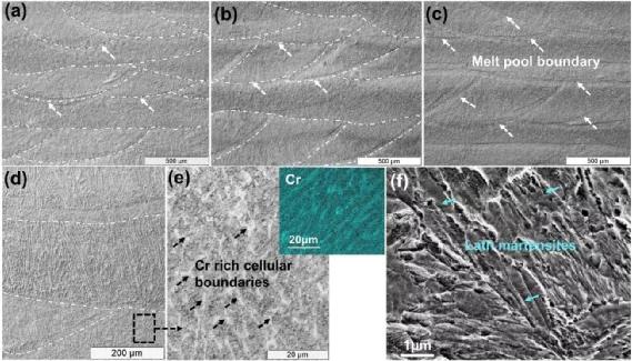 圖 3. LAM 處理的 420 SS 樣品的微觀形態(tài)。(a) 成品,(b) HT427,(c) 雙相-HT,(d) 長(zhǎng)枝晶和 (e) 成品樣品中枝晶邊界處的 Cr 偏析(插入 Cr 的 EDS 映射),以及(e)顯示 HT427 樣品中板條馬氏體的 SEM 圖像。