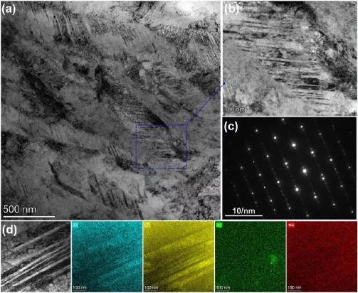 圖 8. HT427 樣品中納米孿晶的微觀結(jié)構(gòu)觀察。(a) BF-TEM 形貌,(b) 納米孿晶的特寫(xiě)視圖,(c) 對(duì)應(yīng)于 (b) 中區(qū)域的納米孿晶的 SADP,以及 (d) 納米孿晶的 EDS 映射分析。