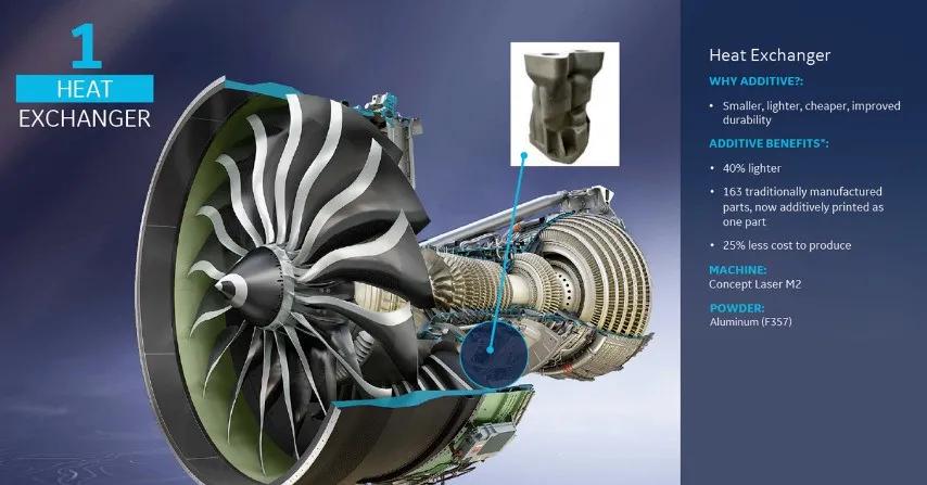 每臺GE9X發(fā)動(dòng)機(jī)安裝有1個(gè)熱交換器,由鋁合金3D打印而成。熱交換器是由原來的163個(gè)零件整合設(shè)計(jì)為一個(gè),重量減輕了40%,生產(chǎn)成本減少25%,并提高了使用壽命。