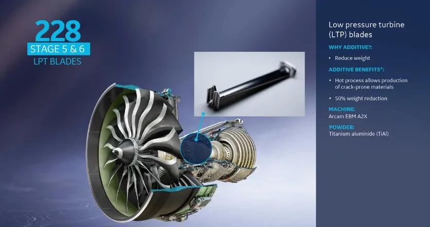 低壓渦輪葉片的材質(zhì)為TiAl合金,屬于脆性材料,SLM技術(shù)成形此材料極易出現(xiàn)裂紋缺陷,導(dǎo)致生產(chǎn)的產(chǎn)品無法滿足工程需求,因此選定了適用于脆性材料成形的電子束粉末床技術(shù)制備該型號葉片。TiAl合金相比傳統(tǒng)的鎳基高溫合金輕50%左右,具有優(yōu)異的比強(qiáng)度,使整個(gè)低壓渦輪機(jī)的重量減少20%,同時(shí)將使GE9X提高了10%的推力,每臺GE9X發(fā)動(dòng)機(jī)上安裝有228片低壓渦輪葉片。