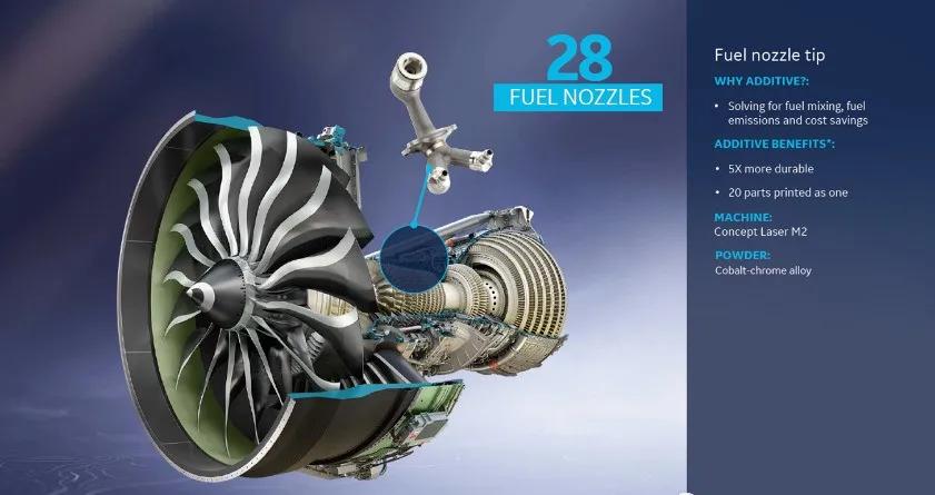 GE9X擁有如此出色的效能,對3D打印技術(shù)的加持有很大關(guān)系。GE9X上應(yīng)用了304個(gè)3D打印零件,其中包括燃油噴嘴、低壓渦輪葉片、T25傳感器外殼、燃燒室混合器、導(dǎo)流器以及熱交換器。