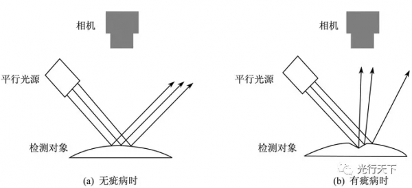 隨著現(xiàn)代工業(yè)的快速發(fā)展, 精密光學(xué)元件在各個工業(yè)領(lǐng)域有著廣泛的應(yīng)用, 光學(xué)元件作為實現(xiàn)光學(xué)功能的載體, 為各類光學(xué)儀器的開發(fā)使用起到了至關(guān)重要的作用。所以, 鑒于光學(xué)元件表面具有的散射特性, 如何更好地對元件表面缺陷進行檢測也隨之被提出來。光學(xué)元件的檢測過程十分繁瑣并且充滿著不確定性, 光學(xué)元件按組成材料可分為普通光學(xué)玻璃、釹玻璃、熔融石英光學(xué)玻璃、氟化鈣(CaF2)等一系列材料; 按光學(xué)元件口徑可有大到幾米也有小到一二毫米的, 差別可達到數(shù)千倍; 按光學(xué)元件外形的不同可分為平板、非球面靶鏡、球面透鏡、柱面透鏡、角錐棱鏡、偏光鏡、玻璃球等。為了適用于以上三個方面的各種光學(xué)元件的需求, 測量儀器、環(huán)境、設(shè)備、技術(shù)必定是各式各樣的。面對如此種類繁多、功能和外形各不相同的光學(xué)元件, 需要我們?nèi)ヌ剿飨鄳?yīng)的檢測技術(shù)。因此, 本文主要從光學(xué)元件表面缺陷、表面散射特性, 以及目前國內(nèi)外各種研究方法等方面, 對光學(xué)元件表面疵病檢測的相關(guān)研究進行綜述, 并探討利用機器視覺的缺陷檢測技術(shù)及未來的發(fā)展趨勢。光學(xué)元件表面面形誤差和表面粗糙度的檢測是光學(xué)檢測技術(shù)研究領(lǐng)域的重點, 由于光學(xué)元件表面質(zhì)量的好壞直接影響整個光學(xué)系統(tǒng)的性能, 所以想要使光學(xué)儀器設(shè)備能更高效地工作, 不僅在加工時需要注意光學(xué)元件的表面質(zhì)量, 而且對成品元件的檢測工作也不能忽視。因此, 光學(xué)元件表面缺陷檢測將成為一項重要而持久的研究課題。所謂的光學(xué)元件表面缺陷, 主要是指表面疵病和表面污染物。表面疵病是指拋光加工后的光學(xué)元件表面依然存在的麻點、劃痕、開口氣泡、破邊、破點等各種加工缺陷, 產(chǎn)生的原因主要是加工過程或后續(xù)的不當操作。圖1所示為四種疵病的大致形狀。劃痕指光學(xué)元件表面長條形的劃傷痕跡。由劃痕長度的不同, 可以分為長劃痕和短劃痕, 以2 mm為界限, 若劃痕長度大于2 mm屬于長劃痕, 小于2 mm則是短劃痕。對于短劃痕, 評價標準是其檢測時的累積長度。相對而言, 劃痕較麻點等缺陷更容易檢測出。麻點指光學(xué)元件表面上的陷坑、蝕坑、疵點, 其坑內(nèi)的表面粗糙度較大, 寬度與深度大致相同, 邊緣也不規(guī)則。一般情況下, 規(guī)定長寬比大于4:1的缺陷為劃痕, 反之小于4:1的缺陷為麻點。氣泡是由光學(xué)元件的生產(chǎn)或加工過程中未及時排除的氣體所形成的, 由于各方向氣體的壓力均勻分布, 所以氣泡的形狀一般呈圓球形。破邊是指出現(xiàn)在光學(xué)元件邊緣的疵病, 雖然處于光源有效區(qū)域之外, 但是也屬于光的散射源, 對光學(xué)性能也會產(chǎn)生一定的影響, 所以也屬于疵病范疇。表面疵病作為一種加工過程中人為造成的微觀局部缺陷, 對光學(xué)元件的表面性能有著一定的影響, 從而有可能造成光學(xué)儀器運行錯誤等嚴重的后果。總之, 光學(xué)元件的表面疵病會對光學(xué)系統(tǒng)性能產(chǎn)生危害, 其根本原因在于光的散射特性。光學(xué)元件表面缺陷對于自身以及整個光學(xué)系統(tǒng)的危害表現(xiàn)在以下幾個方面:(1) 光束的質(zhì)量下降。元件表面缺陷處會產(chǎn)生光的散射效應(yīng), 使得光束在通過缺陷后能量被大量消耗, 從而降低了光束的質(zhì)量。(2) 缺陷的熱效應(yīng)現(xiàn)象。由于表面缺陷所處區(qū)域比其他區(qū)域容易吸收更多的能量, 產(chǎn)生的熱效應(yīng)現(xiàn)象可能會使元件疵病發(fā)生局部變形、破壞膜層等, 進而危害整個光學(xué)系統(tǒng)。(3) 損壞所處系統(tǒng)中其他光學(xué)元件。激光系統(tǒng)中, 在高能激光束的照射下, 元件表面疵病產(chǎn)生的散射光會被系統(tǒng)內(nèi)的其他光學(xué)元件吸收, 從而造成元件的受光不均勻, 當達到光學(xué)元件材料的損傷閥值時, 會使傳播光線的質(zhì)量受到影響, 光學(xué)元件損壞, 更有可能造成光學(xué)系統(tǒng)被嚴重的破壞。(4) 疵病會影響視場清潔。當光學(xué)元件上有過多的疵病時, 會影響微觀的美觀度, 另外, 疵病還會殘留微小的灰塵、微生物、拋光粉等雜質(zhì), 這將造成元件被腐蝕、生霉、生霧, 會明顯影響元件的基本性能。光學(xué)元件表面的散射特性是缺陷產(chǎn)生危害的根本原因。當光束照射到有疵病的光學(xué)元件表面時, 由于疵病位置的反射面并不是一個光滑面, 這些離散無規(guī)則的局部缺陷使部分入射光發(fā)生了偏轉(zhuǎn), 遠離了預(yù)定方向, 變成了偏離主光束的雜質(zhì)光。并且, 這些雜質(zhì)光會產(chǎn)生多次反射透射, 所產(chǎn)生不規(guī)則的散射光會對不同光學(xué)儀器造成不同程度的影響。在光學(xué)系統(tǒng)中, 影響其性能的主要原因是由系統(tǒng)內(nèi)部產(chǎn)生的大量散射光造成的, 而產(chǎn)生這些散射光的根本原因, 又在于光學(xué)元件自身的質(zhì)量, 即使整個光學(xué)系統(tǒng)設(shè)計得再好, 如果內(nèi)部光學(xué)元件的質(zhì)量不過關(guān), 那么構(gòu)成的系統(tǒng)也不能正常工作。因此需要提