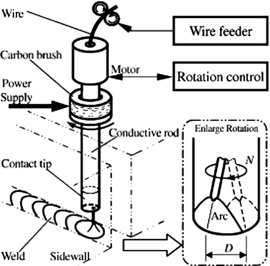 然而,由于槽邊較大,限制了該方法的應(yīng)用范圍。旋轉(zhuǎn)鎢電極設(shè)計用于窄間隙焊接,如圖7所示。周期性旋轉(zhuǎn)電弧可以改善側(cè)壁熔合,并持續(xù)攪拌熔池。在垂直位置的窄間隙焊接中,確保了側(cè)壁的充分熔合。一般情況下,窄間隙電弧焊接通常需要較大的坡口和復(fù)雜的焊接裝置,這會導(dǎo)致焊接效率低,并有可能形成缺乏熔合的缺陷。另一方面,大的殘余應(yīng)力、變形和不良的接頭強(qiáng)度已成為制約窄間隙焊接技術(shù)發(fā)展的主要瓶頸。因此,進(jìn)一步壓縮坡口寬度和引入高能束熱源對提高焊接效率和質(zhì)量是必要的。