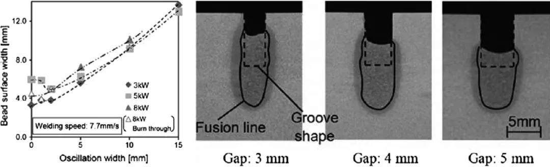 實驗中還研究了激光振蕩焊接及其在窄間隙焊接中的有效性,如圖11所示。通過振蕩激光焊接直接加熱間隙底部附近。然而,一些焊絲碎片可能以固態(tài)形式落入熔池中,導(dǎo)致焊接過程不穩(wěn)定和焊絲成分偏析。當(dāng)激光束振蕩寬度低于間隙寬度時,可通過間隙的上邊緣(試樣前表面)避免激光束干擾?0.5毫米。