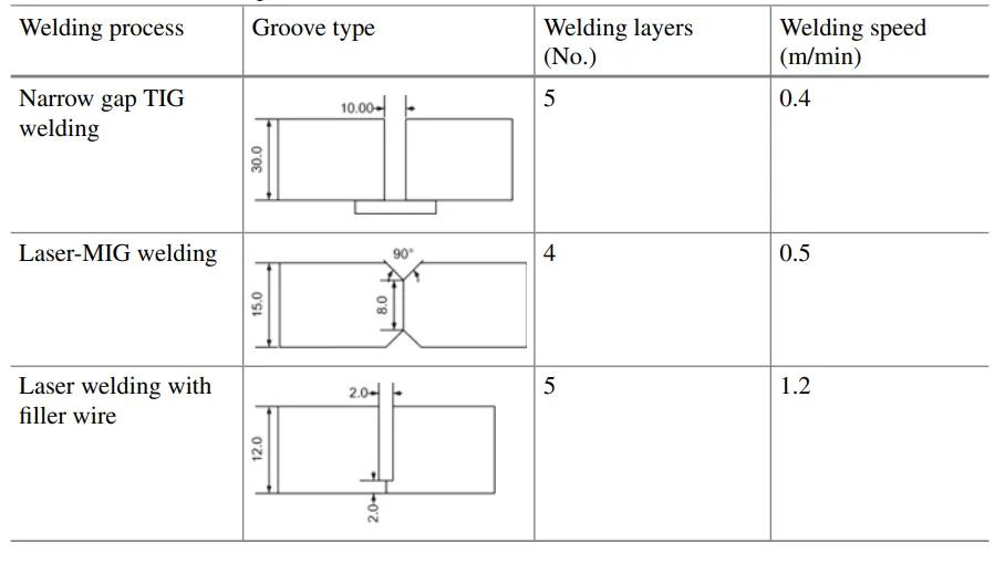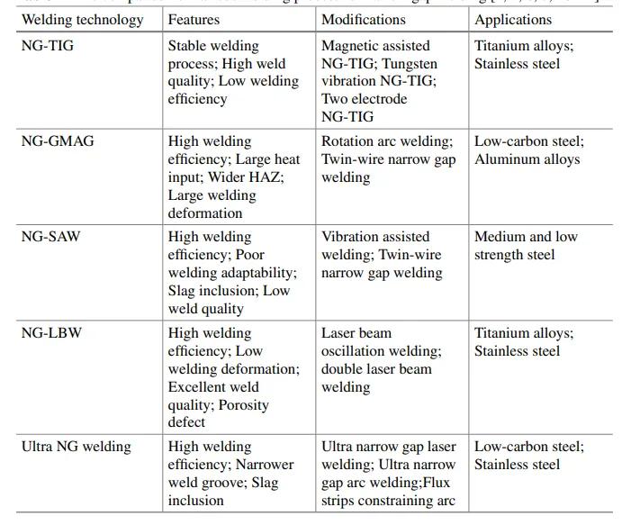 然而,對于厚焊接結(jié)構(gòu),由于微觀結(jié)構(gòu)的不均勻性,機(jī)械性能可能沿厚度方向發(fā)生顯著變化,并且已證明受所選焊接工藝參數(shù)和實際接頭幾何形狀的影響。另一方面,高功率電源和真空環(huán)境的要求限制了其實際應(yīng)用。另一種方法是將低功率電源與填絲窄間隙焊接相結(jié)合,以實現(xiàn)多層焊接,這可以調(diào)節(jié)焊縫微觀結(jié)構(gòu)并改善接頭性能。該技術(shù)具有成本低、焊接生產(chǎn)率高、焊接熱輸入低等特點(diǎn),被認(rèn)為是最適合厚板焊接的方法。窄間隙焊接的過程控制和缺陷抑制非常嚴(yán)格,以獲得無缺陷接頭。表1比較了厚板焊接各種工藝的焊接特性。