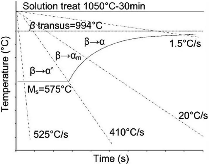 鈦及其合金容易受到大氣污染,并且隨著溫度的升高,晶粒長大,這兩種情況都會對焊接接頭的機(jī)械特性有害。焊接接頭的微觀結(jié)構(gòu)在很大程度上取決于冷卻速度。冷卻速率為525至1.5°C/s?1導(dǎo)致馬氏體相變、塊狀相變和擴(kuò)散相變。410°C以上的冷卻速率?1導(dǎo)致完全馬氏體微觀結(jié)構(gòu),在410和20°C之間觀察到大量相變?1,這種轉(zhuǎn)變逐漸被擴(kuò)散控制的魏氏狀態(tài)所取代,冷卻速率降低,如圖15所示。