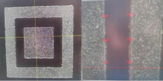 采用YFPP-20-GT150高峰值激光器配F100場鏡在玻璃上進行雕刻測試。經(jīng)測試發(fā)現(xiàn),大脈寬條件下,無論如何調(diào)試,玻璃沒有任何反應;采用10ns左右脈寬,雕刻不穩(wěn)定,且看上去崩邊比較大,如下圖。這是由于脈沖能量過大,峰值功率剛達到玻璃的損傷閾值,材料吸收不穩(wěn)定。
