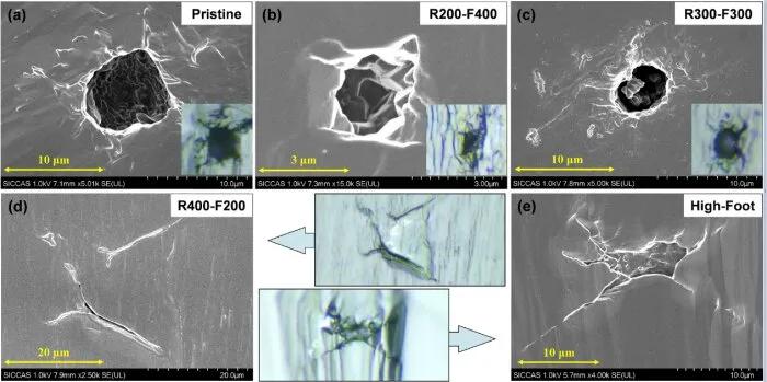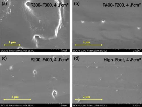 為了研究時(shí)間形狀脈沖對(duì)DKDP晶體LID行為和激光處理的影響,研究人員仔細(xì)研究了損傷形貌。上圖顯示了不同時(shí)間形狀脈沖誘導(dǎo)的典型損傷點(diǎn)形態(tài)。所有的定位點(diǎn)都顯示出類(lèi)似于球形腔或圓芯的特性,其尺寸從10納米到1納米或200納米不等。