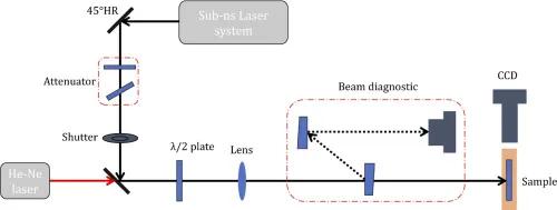 上圖為激光損傷原理圖和用于DKDP晶體的激光調(diào)理試驗(yàn)臺(tái)。由半波片和偏光板組成的能量衰減器對(duì)亞ns激光系統(tǒng)發(fā)出的脈沖進(jìn)行調(diào)節(jié)。光束通過(guò)透鏡聚焦在樣品上,焦距為4.5 m。激光光斑在樣品上的有效面積為0.1±0.01 mm2,使用由兩個(gè)分束器組成的光束診斷和一個(gè)光束剖面儀(LaserCam HR)測(cè)量。使用He-Ne激光器照明DKDP晶體中的體損傷,該激光器與損傷光束共線,并使用放置在激光傳播方向垂直方向的CCD實(shí)時(shí)診斷。