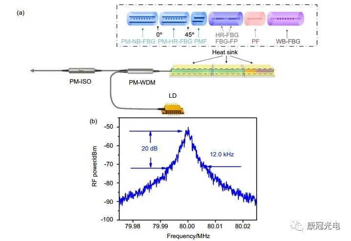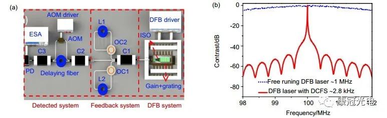 2017年,本文課題組研究了基于雙腔反饋的DFB線寬壓縮方式,將常用MHz量級DFB激光器壓縮至kHz量級,如圖 2所示,為廣泛應(yīng)用的DFB激光提供了一種簡單、有效、低成本的線寬壓縮方式,對于特定波長激光器也可以直接用1或2支FBG替換雙環(huán),其基本原理是一樣的。
