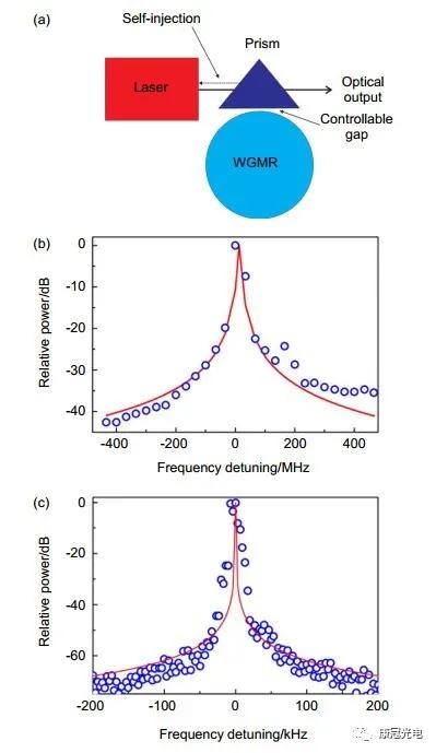 圖 1 (a) 基于回音壁微腔自注入瑞利反饋的激光器線寬壓縮示意圖;(b)線寬為8 MHz的半導(dǎo)體激光器頻譜;(c)線寬為160 Hz窄線寬激光器頻譜