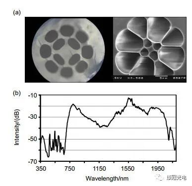 圖 8 (a) 光子晶體光纖截面圖;(b)對應(yīng)超連續(xù)譜