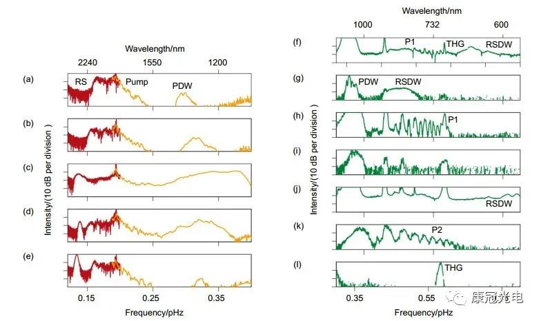 白光光源的發(fā)展經(jīng)歷了鹵鎢燈、氘燈、半導(dǎo)體激光器、超連續(xù)譜光源等各個階段。特別是超連續(xù)譜光源,在具有超強瞬態(tài)功率的飛秒或者皮秒脈沖的激勵下,波導(dǎo)中產(chǎn)生各階非線性效應(yīng),頻譜被極大地展寬,能夠覆蓋從可見光到近紅外波段,且具有很強的相干性。此外,通過調(diào)控特種光纖的色散和非線性值,其光譜甚至可以延展到中紅外波段。此類激光光源在諸多領(lǐng)域得到了極大的應(yīng)用,如光學(xué)相干斷層掃描、氣體探測、生物成像等。受光源和非線性介質(zhì)的限制,早期超連續(xù)譜主要由固體激光器泵浦光學(xué)玻璃,產(chǎn)生可見光范圍內(nèi)的超連續(xù)譜。此后,光纖以其極大的非線性系數(shù)和極小的傳輸模場,逐漸成為產(chǎn)生寬帶超連續(xù)譜的優(yōu)良介質(zhì)。其中的主要非線性效應(yīng)包括四波混頻、調(diào)制不穩(wěn)定、自相位調(diào)制、交叉相位調(diào)制、孤子分裂、拉曼散射、孤子自頻移等,且根據(jù)激勵脈沖的脈寬和光纖的色散不同,各個效應(yīng)所占比重也各不相同??偟膩碚f,現(xiàn)在超連續(xù)譜光源主要朝著提高激光功率和拓展光譜范圍發(fā)展,且注重對其相干性控制。