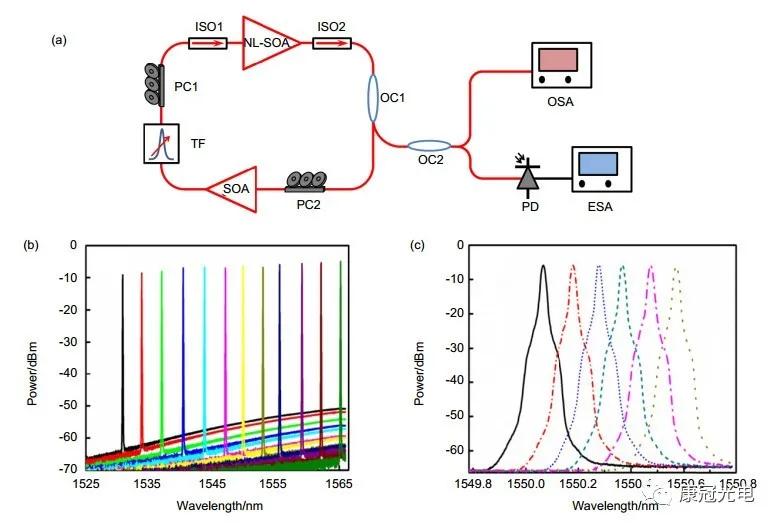 Fig. 7 (a) The tunable narrow-linewidth fiber laser based on the reversed four-wave mixing; (b), (c) The tuning output spectrum