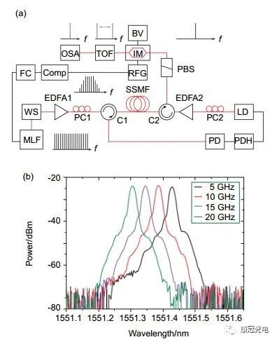Fig. 6 (a) The tunable narrow-linewidth fiber laser based on the frequency-selection from femtosecond frequency combs; (b) The tuning output spectrum