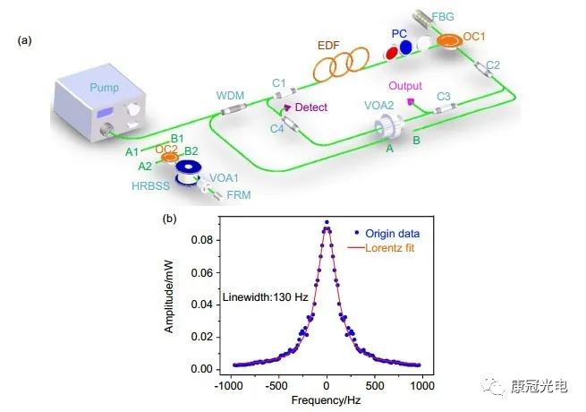 圖 4 (a) 基于瑞利射結(jié)合自注入反饋系統(tǒng)結(jié)構(gòu)圖;(b)輸出功率譜以及其對應(yīng)洛侖茲擬合線寬