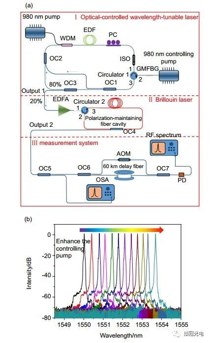圖 5 (a) 光控波長可調(diào)諧窄線寬激光器的實驗裝置圖及其輸出測試系統(tǒng);(b)隨著控制光功率的增加輸出光譜的變化