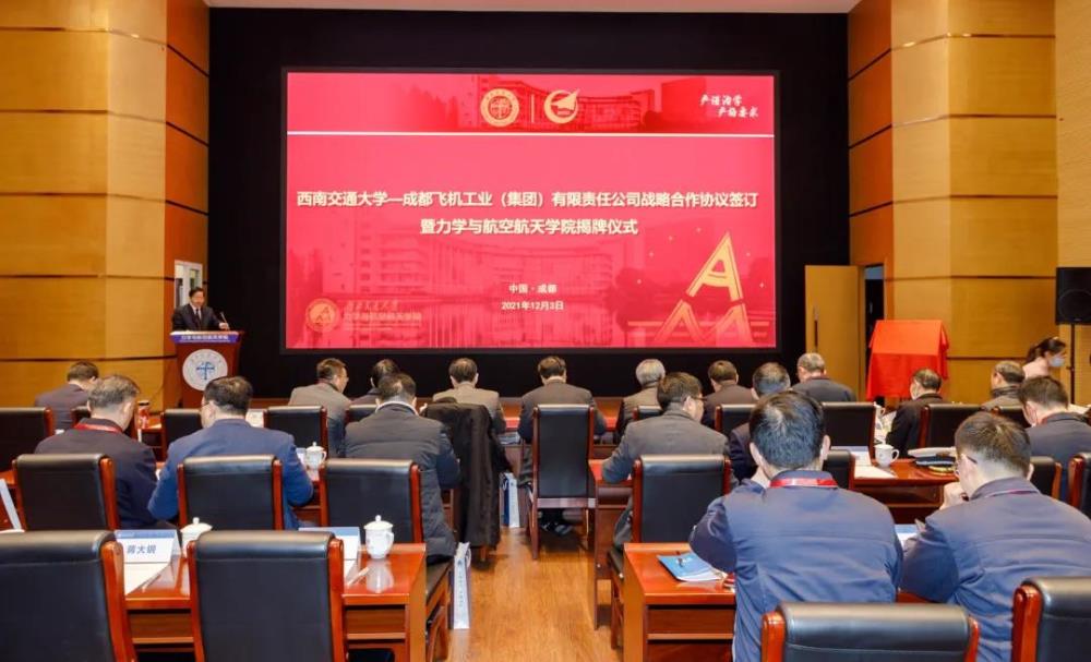 12月3日上午,西南交通大學(xué)與成都飛機(jī)工業(yè)(集團(tuán))有限責(zé)任公司戰(zhàn)略合作協(xié)議簽訂暨力學(xué)與航空航天學(xué)院揭牌儀式在犀浦校區(qū)舉行。