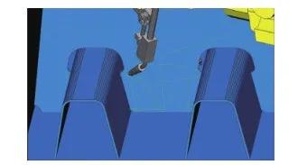 機(jī)器人焊接在立焊端部包角圍焊時(shí),需適時(shí)調(diào)整焊槍姿態(tài)及焊接參數(shù),每側(cè)焊槍的熄弧熔池需越過齒形板的中線,保證圍焊處的焊縫成形飽滿勻順。當(dāng)雙焊槍在一條焊縫兩側(cè)同步進(jìn)行圍焊時(shí),由于焊接熔池?zé)崃窟^大、冷卻速度緩慢,易下淌形成焊瘤,因此采用2個(gè)機(jī)械手在“槽形焊縫”左右兩側(cè)錯(cuò)位焊接,利于保證良好焊縫成形(見圖12、圖13)。