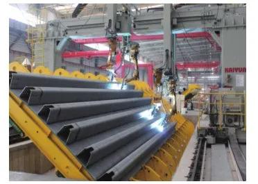 相比于門式多頭(6頭)氣體保護(hù)焊專機(jī)焊接,U肋板單元機(jī)器人焊接在焊縫跟蹤精度與外觀成形方面表現(xiàn)出優(yōu)勢,但一套焊接系統(tǒng)中僅有4把焊槍,無法實(shí)現(xiàn)板單元上所有U肋同步焊接,在焊接效率方面明顯落后。此外,由于U肋內(nèi)焊技術(shù)的應(yīng)用,有了U肋內(nèi)角焊縫的“封底”作用,目前越來越多的U肋外焊采用埋弧焊工藝進(jìn)行,埋弧焊工藝具有更大的焊縫熔深和更高的焊接效率。