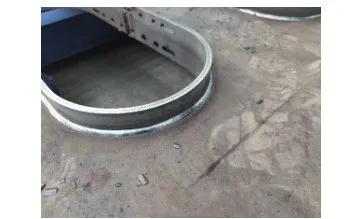 采用點(diǎn)激光傳感方式進(jìn)行焊接尋位,自動(dòng)尋找合適的起弧點(diǎn),焊槍擺動(dòng)焊接,采用電弧傳感焊縫跟蹤技術(shù),保證焊接精度。為避免定位焊縫對(duì)于激光尋位精度的影響,定位焊縫需與起弧點(diǎn)保持一定距離。機(jī)器人焊接系統(tǒng)可完成橫隔板孔圈加勁、斜邊加勁、平角焊、立角焊與包角焊等多種形式焊縫的焊接??兹觿藕缚p成形如圖7所示。