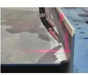 2020年,武船重工將焊接機(jī)器人用于橫肋板單元焊接(見圖8),該機(jī)器人系統(tǒng)在軌道式門架下倒裝2個(gè)機(jī)械手,門架橫梁上配備有一組工業(yè)相機(jī)。門架縱向移動(dòng),深度相機(jī)全景識(shí)別系統(tǒng)掃描工件生成三維點(diǎn)云圖,相關(guān)數(shù)據(jù)提供給工件識(shí)別算法軟件,完成工件的類型和包含組件的智能識(shí)別與定位,而后自動(dòng)完成工件焊接的編程,實(shí)現(xiàn)全自動(dòng)編程功能。在此之前需要建立橫肋板的類型庫和組件的特征庫,并建立與之對(duì)應(yīng)的焊接工藝庫。在機(jī)械手端部安裝有激光傳感器,采用線激光掃描技術(shù)(見圖9),可精確定位焊縫并在焊接過程中實(shí)現(xiàn)跟蹤功能,焊槍采用不擺動(dòng)方式進(jìn)行焊接。在焊槍上安裝有焊接煙塵吸收裝置,達(dá)到了良好的除煙除塵效果。