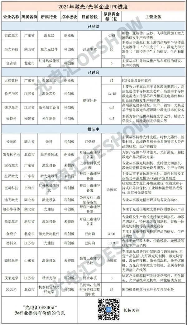 上市盤點 :激光器上市企業(yè)主流品類集齊,還有17家正在路上