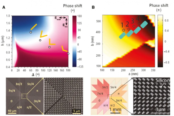 圖4 幾何相位可以實現(xiàn)對納米天線的全相位控制,從而產(chǎn)生光學渦旋。(A)一組四個V形納米天線的相位斜坡覆蓋從0到π的范圍,通過以π/2旋轉(zhuǎn)元件,幾何相位產(chǎn)生的附加π相位使得沿方位方向拍后產(chǎn)生光學渦旋。(B)由硅納米棒組成的混合介電亞表面能夠在寬光譜范圍內(nèi)實現(xiàn)高轉(zhuǎn)換效率。