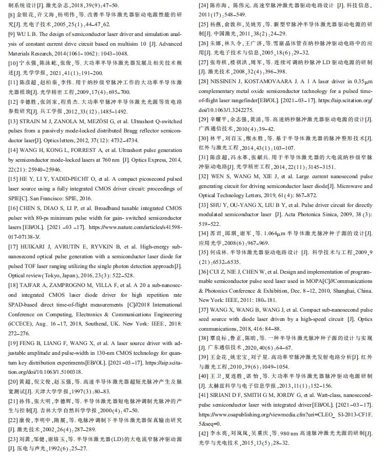 綜上所述,半導(dǎo)體脈沖激光器主要通過(guò)優(yōu)化激光器結(jié)構(gòu)、材料和加工工藝及改進(jìn)驅(qū)動(dòng)電源特性的 2 種方式實(shí)現(xiàn)性能提升。本文主要對(duì)這 2 種方式的半導(dǎo)體脈沖激光器發(fā)展情況進(jìn)行總結(jié)與分析,著重介紹了提升驅(qū)動(dòng)電源特性 的 5 種方法。目 前,脈沖寬度 在 5~10 ns 的技術(shù)相對(duì)成熟,ps 級(jí)脈寬已成為該領(lǐng)域的必然發(fā)展趨勢(shì)。但是,激光器在追求大功率的同時(shí)往往存在功耗高的問(wèn)題,仍需進(jìn)一步研究和解決。隨著數(shù)字化與半導(dǎo)體光電子技術(shù)的發(fā)展,各領(lǐng)域?qū)Π雽?dǎo)體脈沖激光器需求愈來(lái)愈大,因此研究大功率、窄脈沖、低功耗和小型化半導(dǎo)體脈沖激光器具有重大意義。