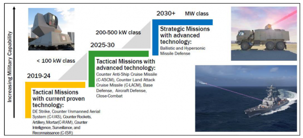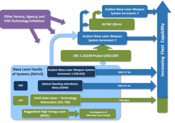 固態(tài)激光技術(shù)成熟化項目(SSL-TM)采用光纖體制,激光發(fā)射功率為150kW,可以有效對抗海面無人機、小艇等非對稱威脅目標。2019年10月,SSL-TM系統(tǒng)完成研制并運至圣地亞哥,集成到“波特蘭”號兩棲船塢運輸艦上,2020年5月在海洋環(huán)境下成功擊落無人機,2021年12月在亞丁灣成功擊落海面漂浮訓練目標。固態(tài)激光技術(shù)成熟化項目(SSL-TM)樣機成功擊中空中漂浮目標“太陽神”項目(HELIOS)采用光纖光譜合成技術(shù)路徑,發(fā)射功率為60kW(可拓展至150kW),計劃部署在“阿利·伯克”導彈驅(qū)逐艦上并完成與宙斯盾作戰(zhàn)系統(tǒng)集成,具備遠距離情報、監(jiān)控、偵察(ISR)、反無人機等作戰(zhàn)能力,同時也為美海軍將來研制能夠?qū)寡埠綄椀募す馕淦魈峁┘夹g(shù)積累。2021年秋季,HELIOS系統(tǒng)在瓦勒普斯島海軍陸基測試基地完成多項測武,具備裝艦集成條件,于2022年1月運往圣地亞哥,計劃集成到Flight IIA 型阿利·伯克級導彈驅(qū)逐艦 ‘普雷貝爾號(USS Preble)’號上,準備出海開展作戰(zhàn)性能驗證。 光學眩目攔裁器(ODIN)是一套低功率的激光武器系統(tǒng),旨在通過投射"炫目"激光束來致盲敵方目標。美海軍計劃使用ODIN系統(tǒng)來破壞和打擊多種威脅,包括水面艦艇、飛機和無人機,甚至一些反艦導彈上的光電設(shè)備。美國海軍計劃在8艘導彈驅(qū)逐艦上安裝ODIN系統(tǒng),增強驅(qū)逐艦的分層防御能力,目前己完成3套裝艦部署。對抗反艦巡航導彈的高能激光項目(HELCAP)旨在評估、開發(fā)、試驗、演示各種激光技術(shù),發(fā)射功率將達到300kW,能夠跟蹤巡航導彈并燒蝕,實現(xiàn)對敵方反艦巡航導彈的有效攔截,計劃在2023財年具備驗證條件。美海軍一直致力于提升激光武器對抗水面艇和無人系統(tǒng)的能力,最終目標是能對抗反艦彈道導彈,研發(fā)規(guī)劃如下圖所示。美國海軍研究辦公室的發(fā)展規(guī)劃顯示,固態(tài)激光器是未來艦載激光武器的發(fā)展重點,目前正在開展的項目包括固態(tài)激光技術(shù)成熟化項目(SSL-TM)、光學眩目攔截器(ODN)、“太陽神”項目(HELIOS)、對抗反艦巡航導彈的高能激光項目(HELCAP)。其中前三個項目統(tǒng)稱為“海軍激光系統(tǒng)家族”(NFLoS)。在美國海軍的激光武器研發(fā)路徑規(guī)劃中,NFLoS項目和HELCAP項目,結(jié)合國防部其他部門的激光技術(shù),將用于支持未來能力更強的激光武器研發(fā),即海軍水面激光武器系統(tǒng)增量2和增量3項目。根據(jù)美國防部制定的激光武器系統(tǒng)發(fā)展路線,為了有效應(yīng)對反艦巡航導彈和超音速導彈,激光武器的發(fā)射功率將逐步提升,計劃在2024財年完成30萬瓦~50萬瓦級固態(tài)激光器的研制和演示,具備攔截反艦導彈的能力;到2030財年將功率等級提升至兆瓦級,具備對抗彈道導彈及超音速導彈的能力。