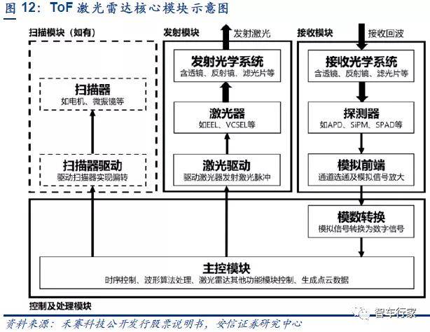 ToF 激光雷達系統(tǒng)主要包括發(fā)射模塊、接收模塊、控制及信號處理模塊和掃描模塊。