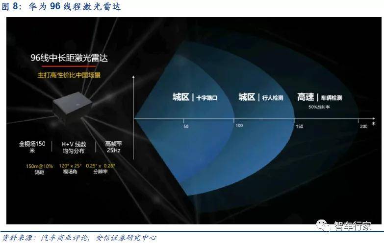 同時,激光雷達也常以線數(shù)區(qū)分,如 4 線、8 線、16 線、32 線、128 線等。線數(shù)是指激光發(fā)射光源數(shù),16 線產(chǎn)品有 16 個光源,以此類推,華為近期發(fā)布的 96 線激光雷達就是含有96 個光源的激光雷達。