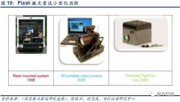 Flash 激光雷達也經(jīng)歷了小型化發(fā)展歷程,所占空間從起初的車廂級到辦公桌級,再到現(xiàn)在的厘米級,這都得益于緊湊型激光器陣列、探測器陣列的發(fā)展。