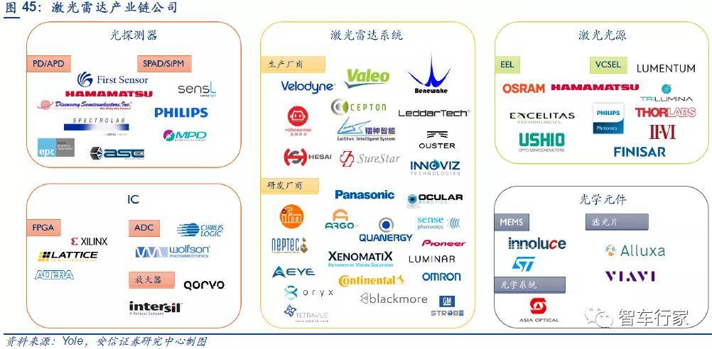 在這樣的產(chǎn)業(yè)鏈當中,全球分布著大量業(yè)務(wù)不同的廠家,歐姆龍、松下、意法半導體、賽靈思、飛利浦、Qorvo 等知名公司都在激光雷達產(chǎn)業(yè)鏈之中。