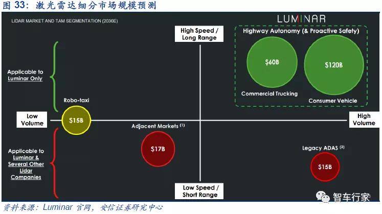 激光雷達領(lǐng)域的另一家國際龍頭Luminar則根據(jù)不同細分領(lǐng)域上的需求空間和不同應(yīng)用場景的速度、探測距離對激光雷達的細分市場規(guī)模進行劃分。