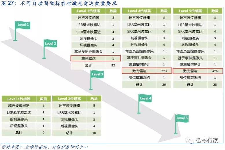 不同級別的自動駕駛技術(shù)的應(yīng)用對于各類傳感器的數(shù)量的要求也是不同的,隨著自動駕駛技術(shù)標準的提高,對于車載激光雷達所要求的數(shù)量就越高,L5 級自動駕駛標準下,激光雷達的配置數(shù)量不應(yīng)少于 4 個。