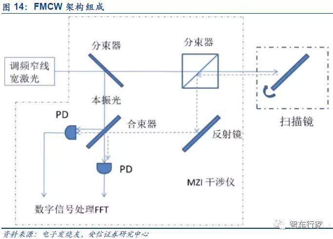 而 FMCW 激光雷達通過檢測返回光和發(fā)射光的時間、頻率和波長,濾除不匹配的數(shù)據(jù),從而實現(xiàn)更精確的目標檢測。但其劣勢是光學校準復雜,需要連續(xù)性強的光源,而且線性調(diào)制較為困難。