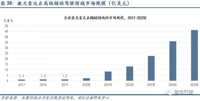 激光雷達在高級輔助駕駛領(lǐng)域的市場規(guī)模將在未來 5 年里保持高速增長,按照沙利文預(yù)計,2025 年激光雷達市場規(guī)模預(yù)計將達到 46.1 億美元,2019 年至 2025 年復合增長率達 83.7%。