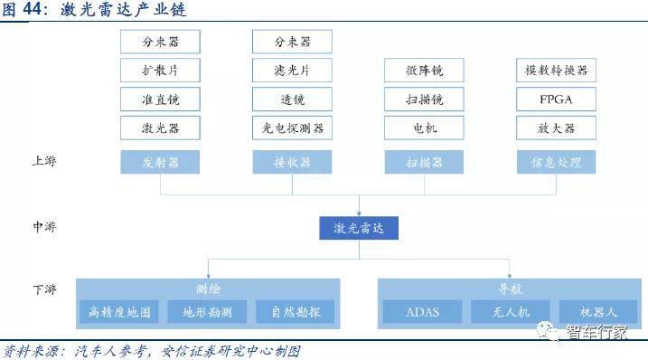 激光雷達巨大的產(chǎn)業(yè)規(guī)模之下,是一條由多個環(huán)節(jié)構(gòu)成的、上下游明確的產(chǎn)業(yè)鏈。下游應(yīng)用領(lǐng)域主要包括測繪和導航兩大類需求,如今,下游需求蓄勢待發(fā),自動駕駛、高精度地圖等市場都存在大量需求。